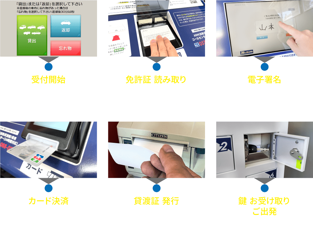 自動貸渡機のカンタン操作だけで出発・返却手続きOK!煩わしい対面受付はありません。